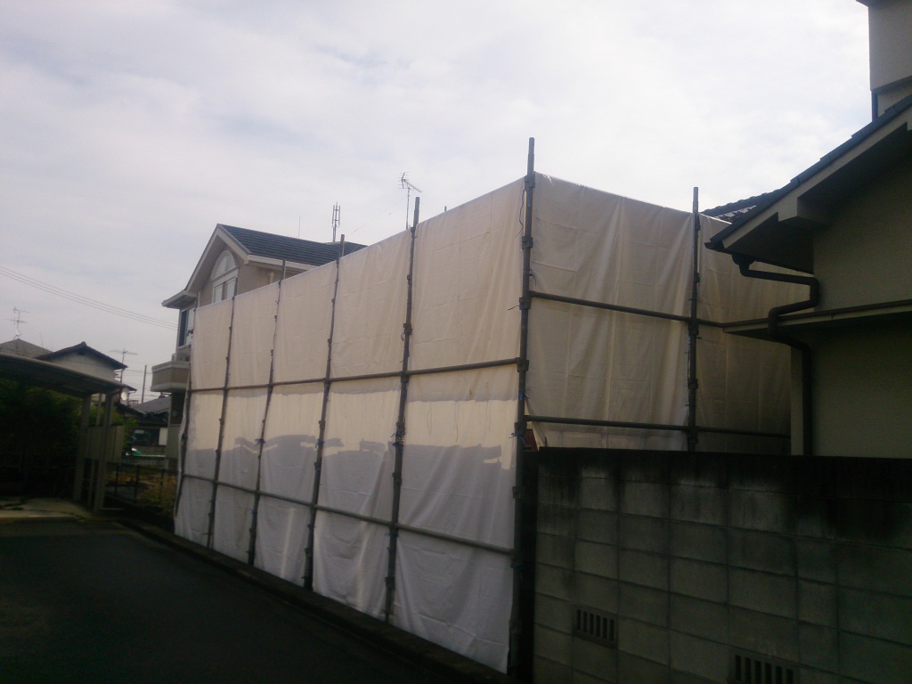 まずは、ぐるりと養生シートで家を覆います。