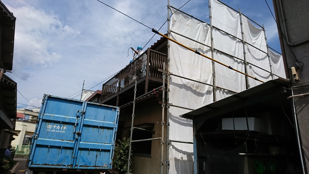 家の外側をぐるりと養生シートで覆います。