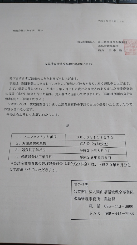先月、当社の廃棄物(燃え殻)の抜き取り検査が行われ、先日その