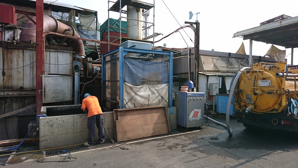 右に見えるのは吸引車で、焼却炉内部の汚れを吸い取ります。巨大