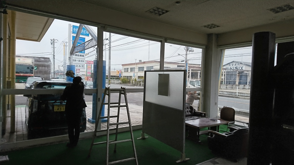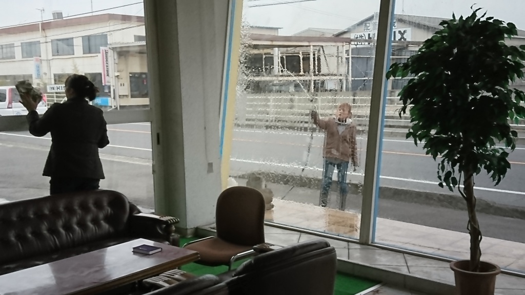 窓ふきも丁寧に。当社の窓は全面ガラス張なので、正直窓ふきは面