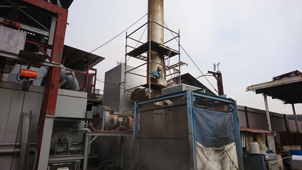検査員の方が煙突のほうに見えますね。煙突から排出され