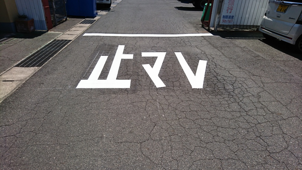 先日、当社敷地内の入り口と出口に「止まれ」の標示をつけました。