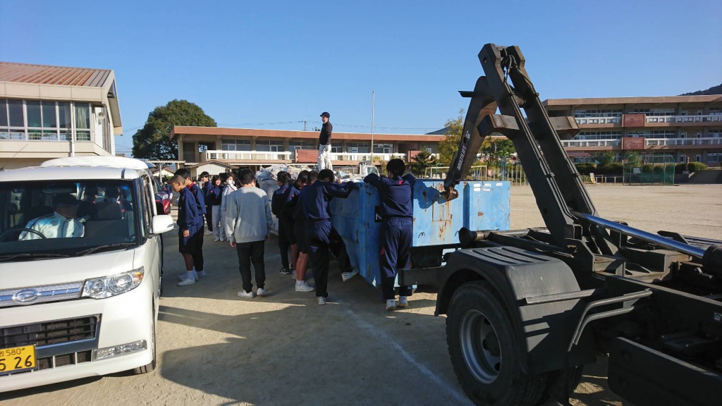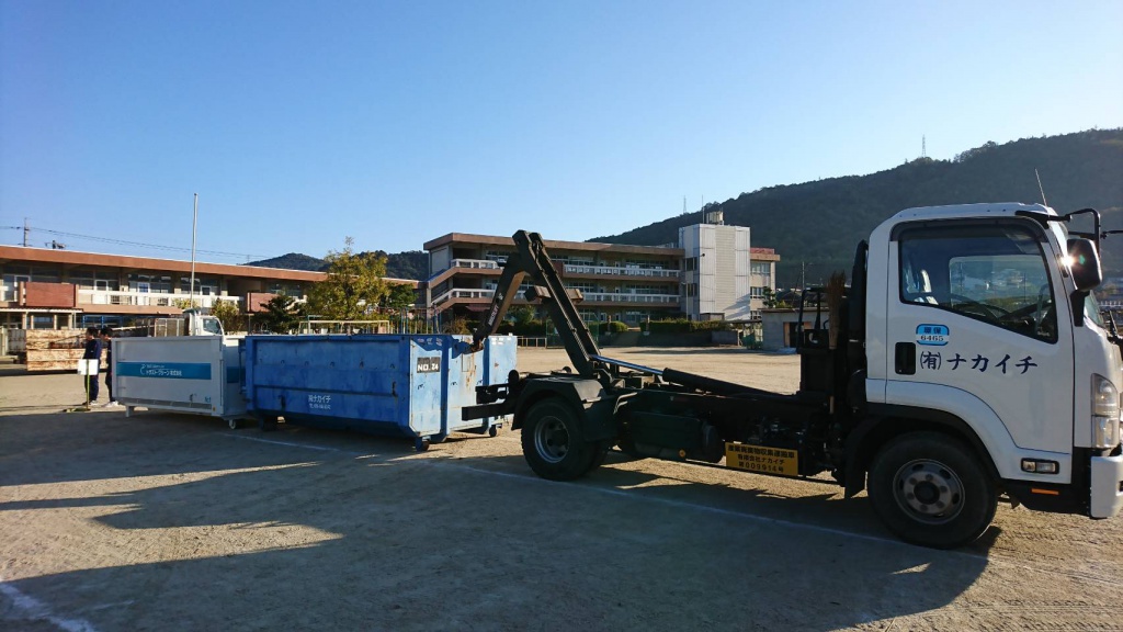 現場は、笠岡市の吉田小学校。日曜日の快晴のもと、当社を含め3台のトラック
