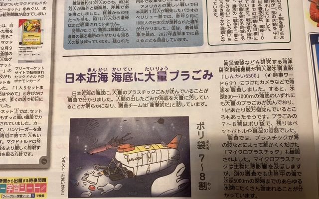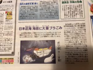 この二つの新聞記事。読んでみると、深海にまでプラスチックごみが漂い、深海には光が届かず自然分解もされずにマイクロプラスチックとなり生態環境に影響を及ぼしているとのこと。海は世界とつながっており一つの国だけで解決する問題ではなく、各国が危機意識をもって取り組まないと解決しなと書かれています。