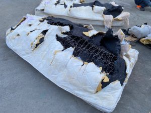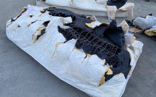ベッドマットです。ベッドマットは見た目はクッション素材でふかふかですが、表面の生地を切ってみると中はスプリング、木枠、スポンジ素材、ネジなどの金属といった部品でできています。いわゆる複合製品ですね。大きさもシングルサイズからキングサイズまでいろいろありますが、一番小さいシングルサイズでも破砕機に直接投入できる大きさではありませんし(もちろん直接投入できる大型の破砕機もあります)、そもそもいろいろな素材でできていますからまずこれらを分解して選別しなければなりません。