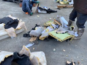 このようにすべての部品を取り除いてやっと破砕機に投入することができます。ここまでするのに時間も人手もかかりますから、ベッドマットのような複合製品は処理単価が高いんですね。製造する側は良い製品を作ろうとしてこのようにたくさんの素材を使って作っているのでしょうが、処理する側からするとたくさんの素材を使っているがゆえに処理する工程は複雑になりコストもかかることになるんですね。どちら良い悪いではなく、このような複合製品を処理していると製造から廃棄までを考えた物作りって大切だなぁといつも思わされます。