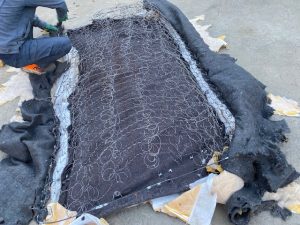 表面の生地を切っていくとスプリング(金属)がびっしりと見えてきました。