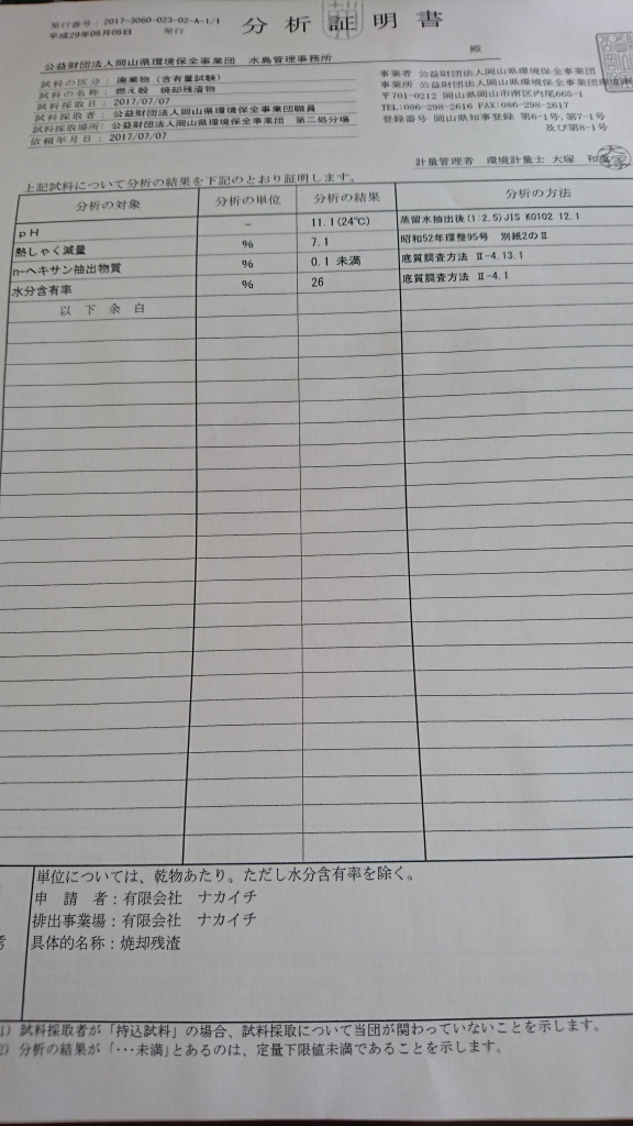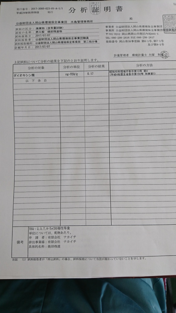 先月、当社の廃棄物(燃え殻)の抜き取り検査が行われ、先日その